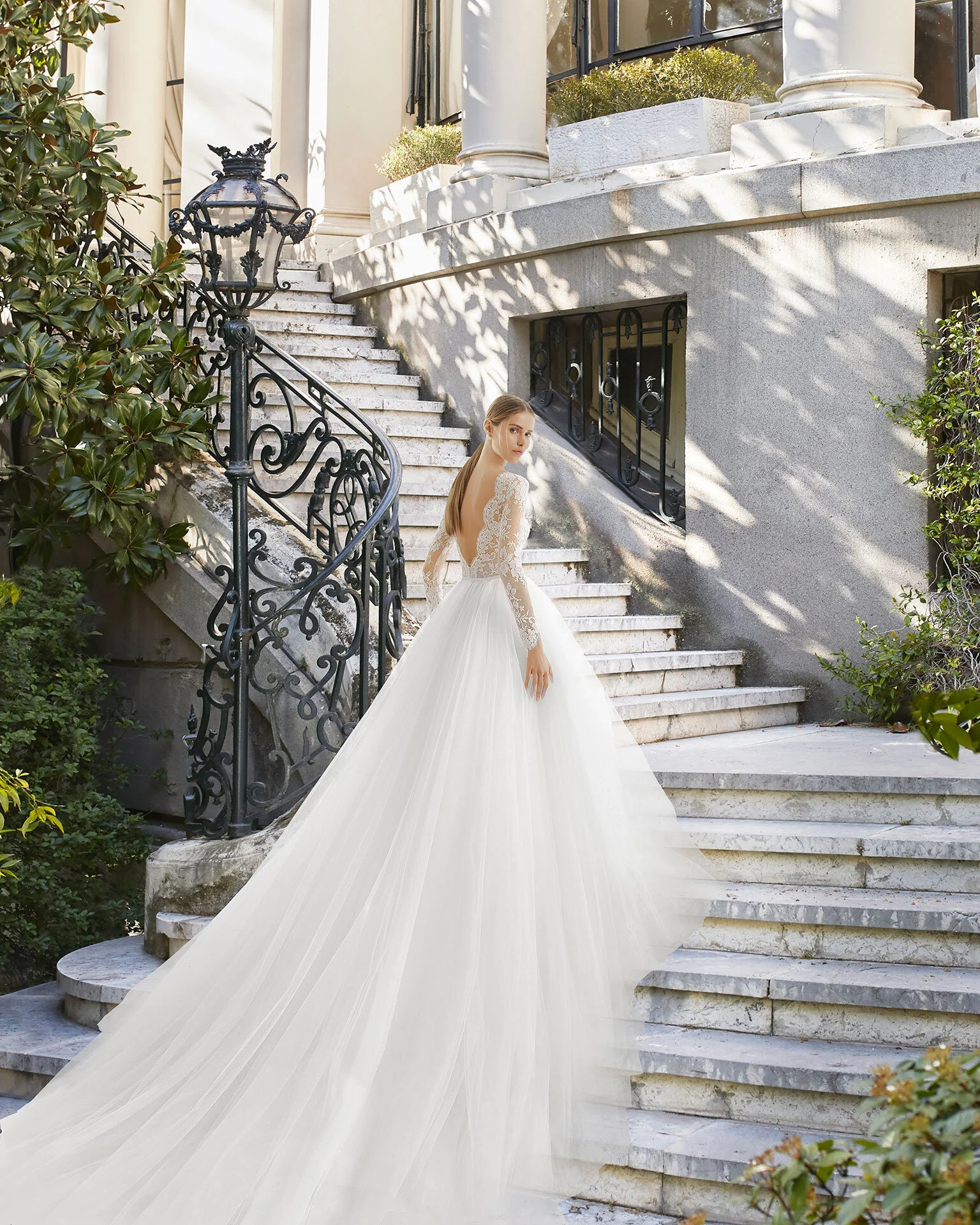 The NYC Rosa Clara Niher is one of those wedding dresses created with stellar inspiring bound to create an impression. Fashioned as a princess-style long-g sleeved wedding dress, the NYC Rosa Clara Niher, is made up of a transparent lace bodice combined with boat neckline and a wonderful full tulle skirt and all with natural fabrics.